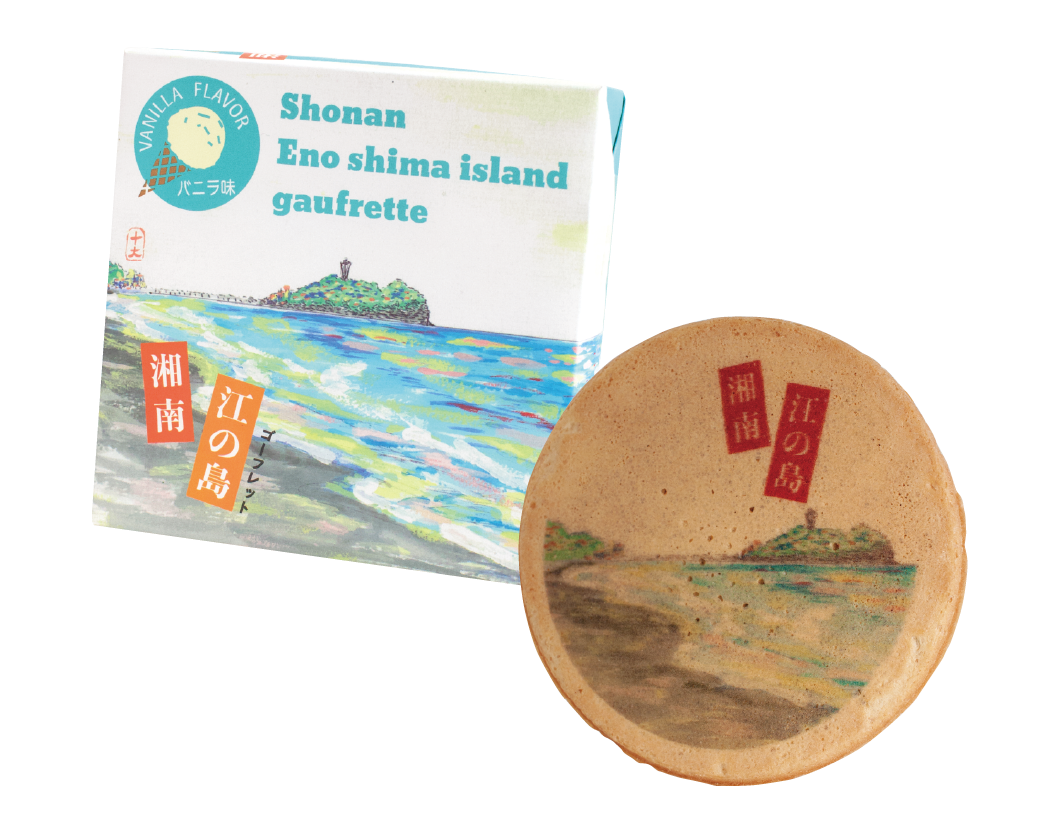 江の島のイラストをプリントした焼き菓子です。バニラクリームをサンドしました